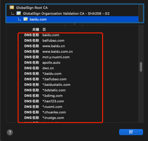 Mac想导出有点麻烦。但是一个命令可以查看该证书的所有信息,并复制DNS信息保存。