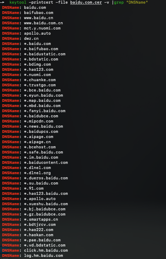 keytool -printcert -file xxxx.cer |grep "DNSName"输出DNS复制即可。如下: