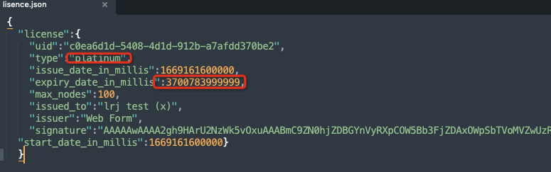 申请下来的License中的type改为platinum,将expiry_date_in_millis延长N年时间: